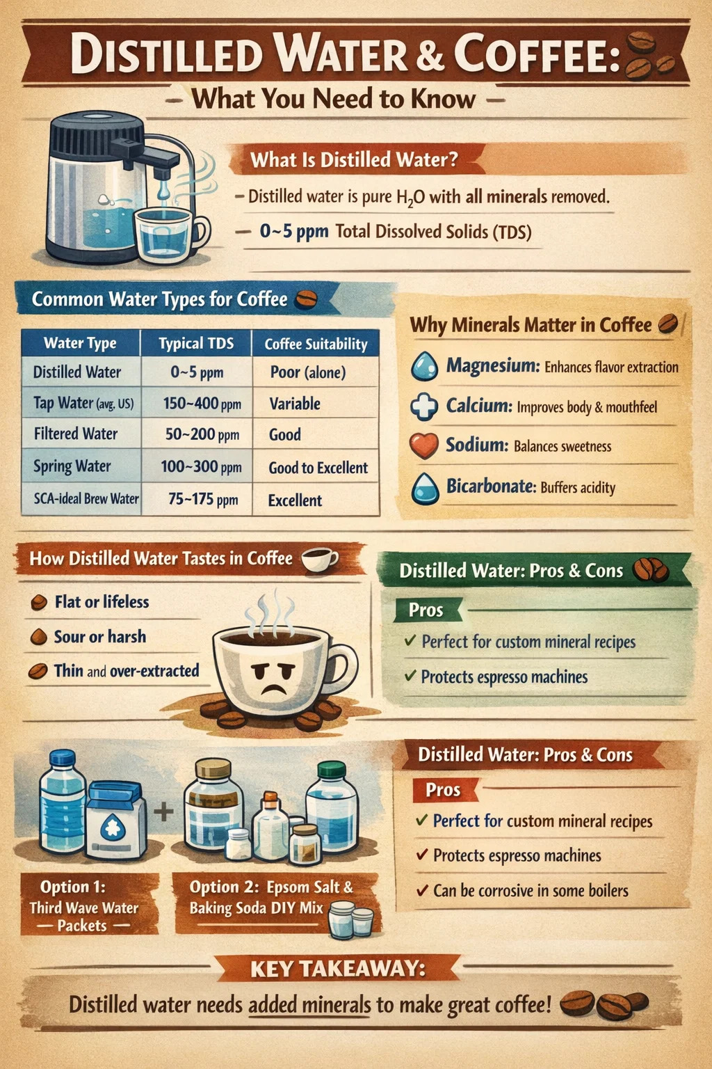 Ovaj članak objašnjava što se točno događa kada koristite destiliranu vodu za kavu, što kaže znanost, kako destilatori vode utječu na to i koje vam alternative daju bolje rezultate bez nagađanja.