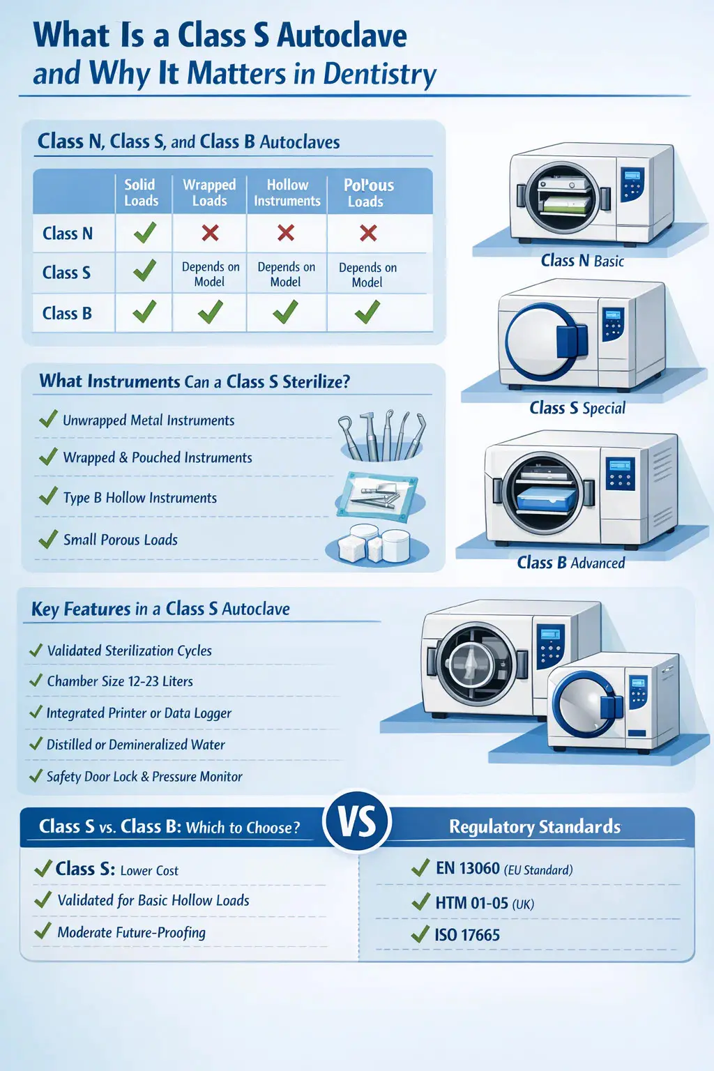 Autoklav klase S parni je sterilizator dizajniran za rukovanje određenim rasponom opterećenja definiranim od strane proizvođača — koji se nalazi između osnovne klase N i potpuno sposobne klase B u smislu izvedbe sterilizacije. U stomatološkoj praksi, autoklav klase S jedna je od najčešće korištenih jedinica za sterilizaciju , jer nudi praktičnu ravnotežu između cijene, brzine ciklusa i mogućnosti obrade šupljih i poroznih instrumenata koji su standardni u svakoj stomatološkoj klinici.
