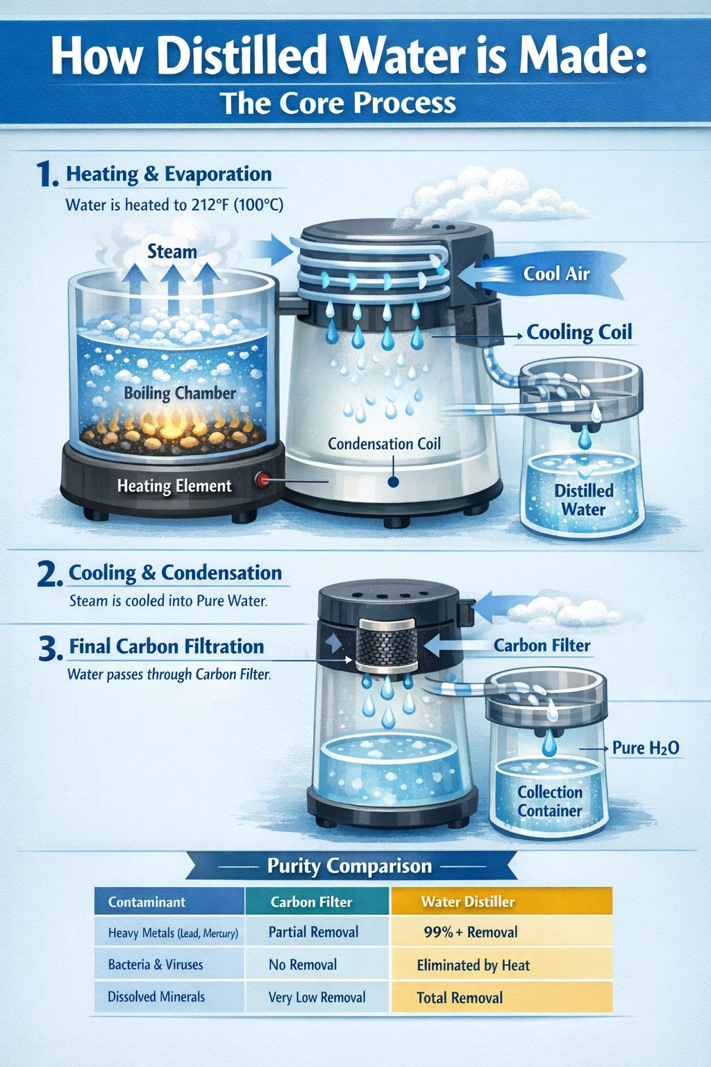 Proces počinje kada se komora za kuhanje destilator vode puni se vodom iz slavine. Električni grijaći element na dnu podiže temperaturu na 212°F (100°C) . Kako voda dosegne točku ključanja, pretvara se u paru. Hlapljivi plinovi mogu biti ispušteni kroz otvor, dok nehlapljivi kontaminanti poput olova, arsena i fluorida ostaju zarobljeni u kipućem spremniku.