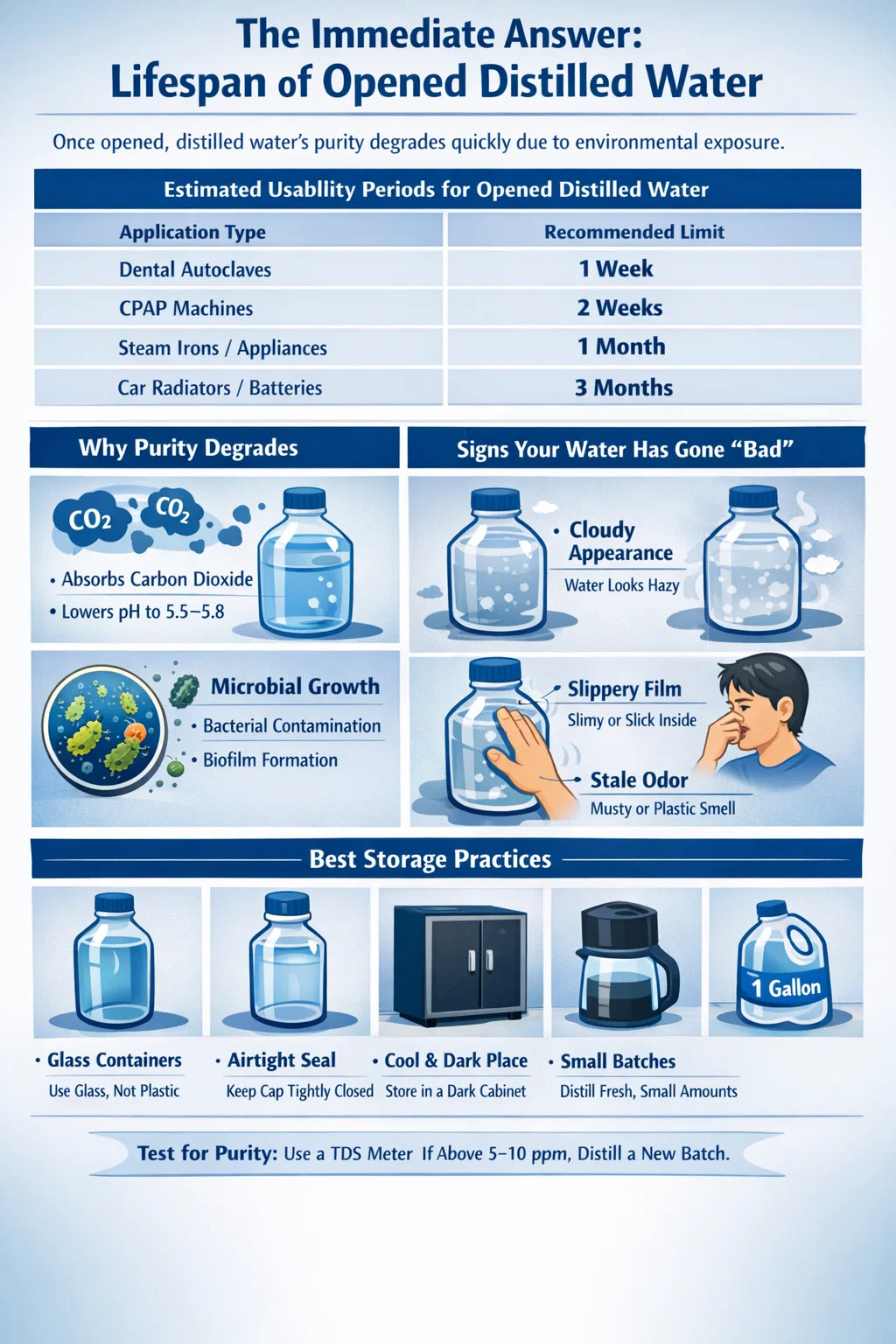 Ako koristite kućni destilator vode , imate prednost proizvodnje svježih serija na zahtjev. Za održavanje najviše kvalitete, slijedite ove protokole za pohranu: