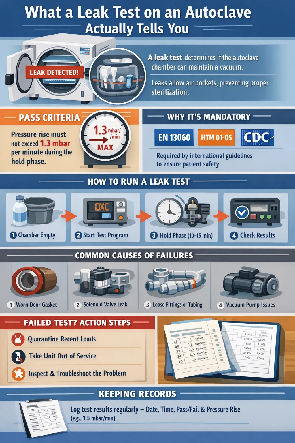 Zabilježite datum, vrijeme, rezultat (prošao/nije prošao) i stvarnu vrijednost porasta tlaka ako je vaša jedinica prikazuje. Mnoge stomatološke ordinacije koriste papirnati dnevnik ili digitalnu proračunsku tablicu. Neki autoklavi automatski ispisuju zapis ciklusa. Čuvajte evidenciju najmanje dvije godine ili dulje ako to zahtijeva vaše lokalno regulatorno tijelo. Ova se dokumentacija pregledava tijekom inspekcija u praksi i neophodan je dokaz ako se ikada istraži neuspjeh sterilizacije.