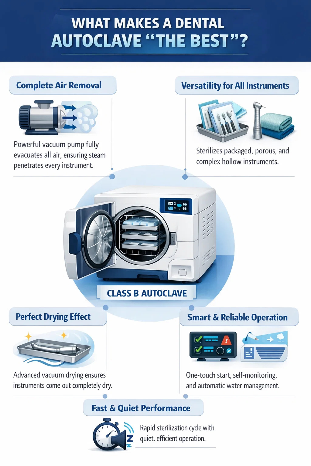Prosuđujući je li a zubarski autoklav spada u kategoriju "najboljih" može se učiniti iz sljedećih praktičnih perspektiva: